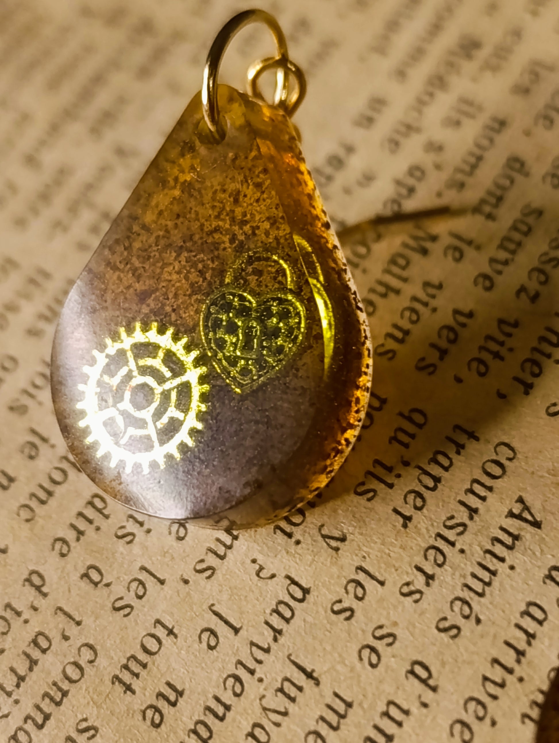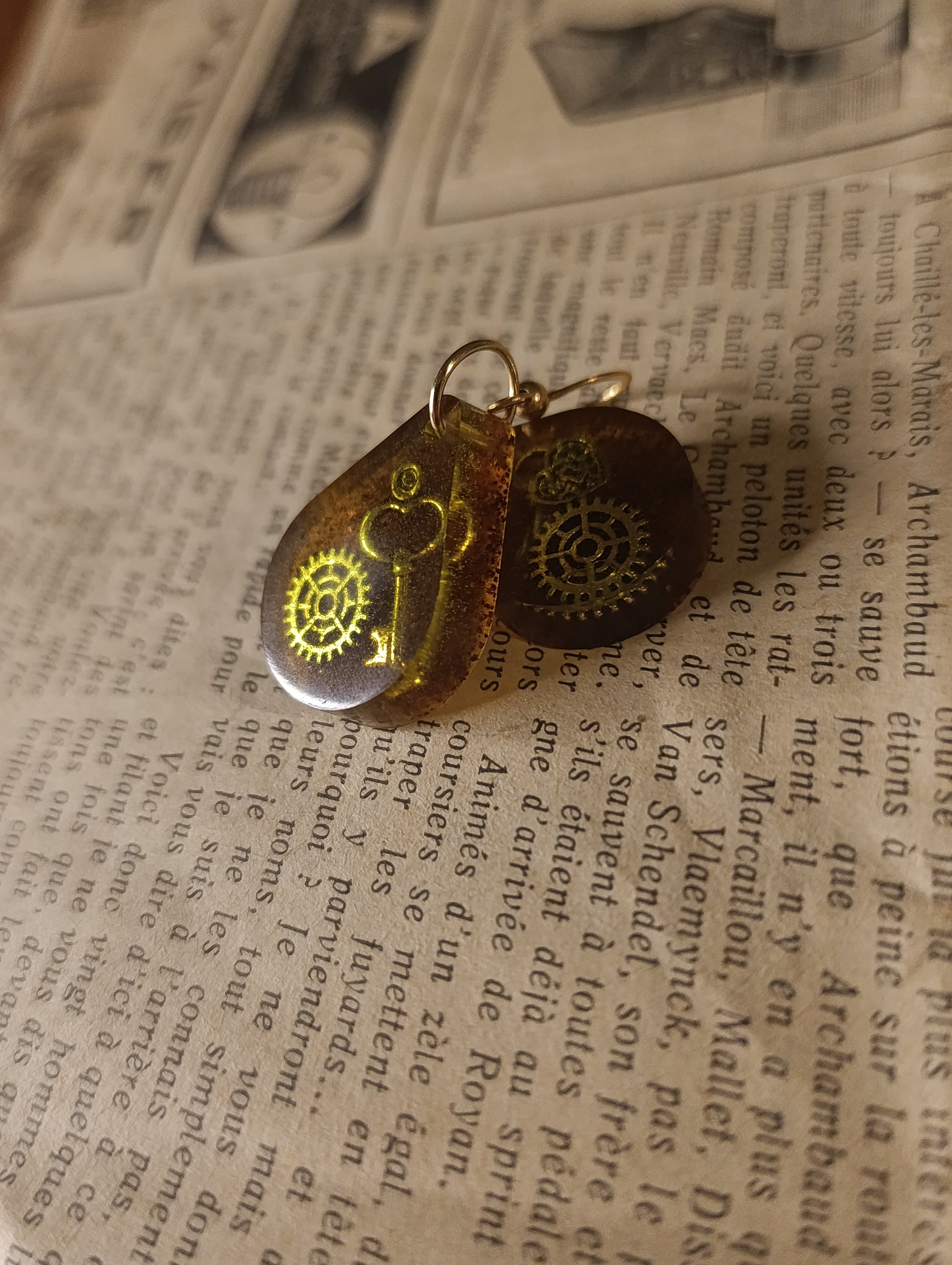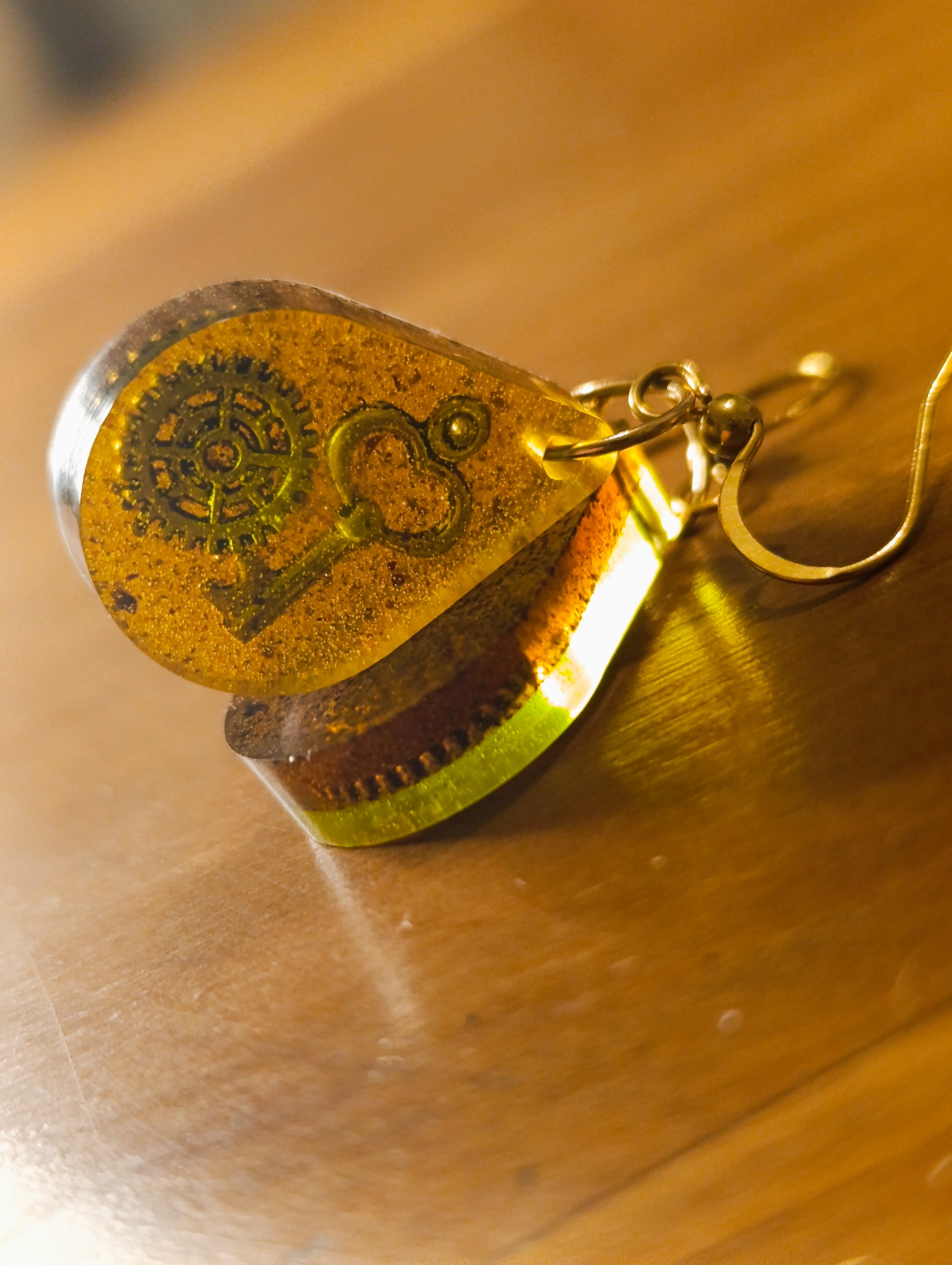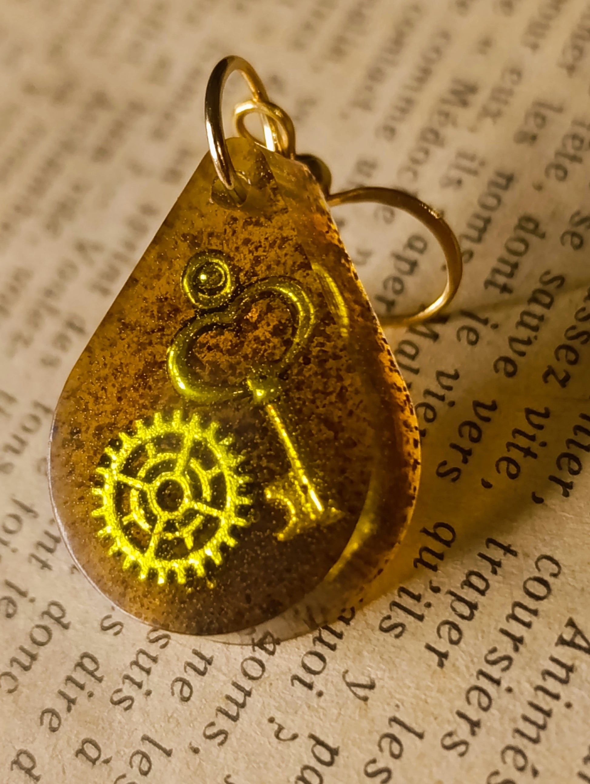 Une paire de boucles d’oreilles dépareillées, où une clé et son cadenas semblent prisonniers d’un pendentif en résine unique. Façonnés en deux couches, ces bijoux révèlent une teinte ambrée aux reflets de jade, évoquant un charme ancien, une romance secrète et un mystère intemporel.