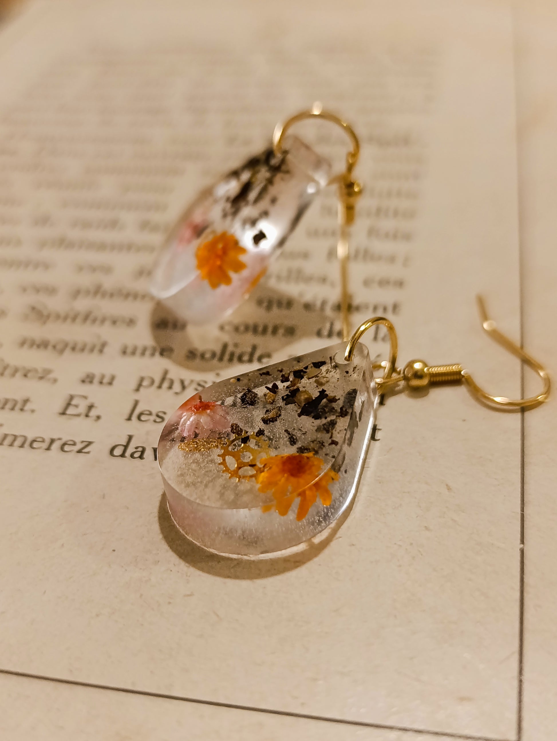 Chaque création étant unique, la disposition ainsi que le nombre d’éléments emprisonnés dans la résine peuvent légèrement varier d’une pièce à l’autre. Les photos sont donc fournies à titre illustratif : chaque paire possède son propre caractère, pour un bijou aussi unique que la personne qui le porte.