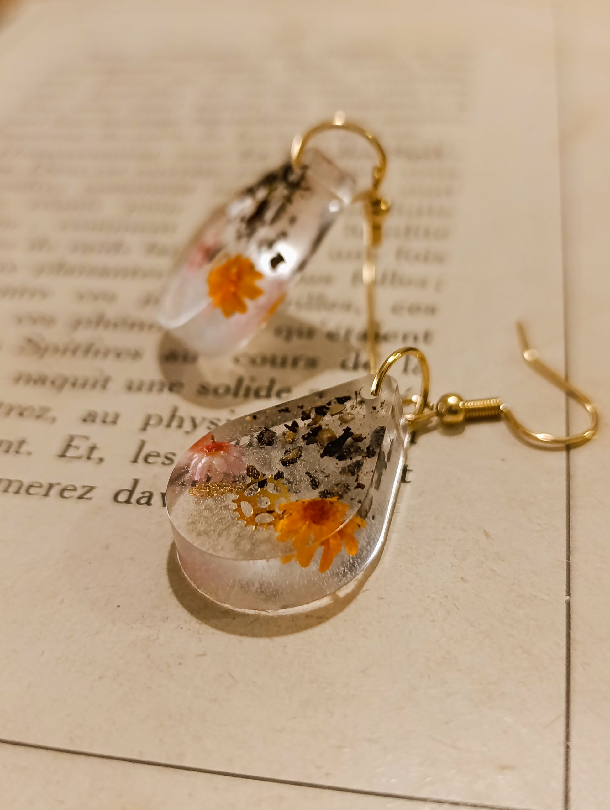 Une paire de boucles d’oreilles en résine, où des éclats noirs effleurent des fleurs colorées, tandis que de petits engrenages dorés flottent au cœur de ce contraste mystérieux.