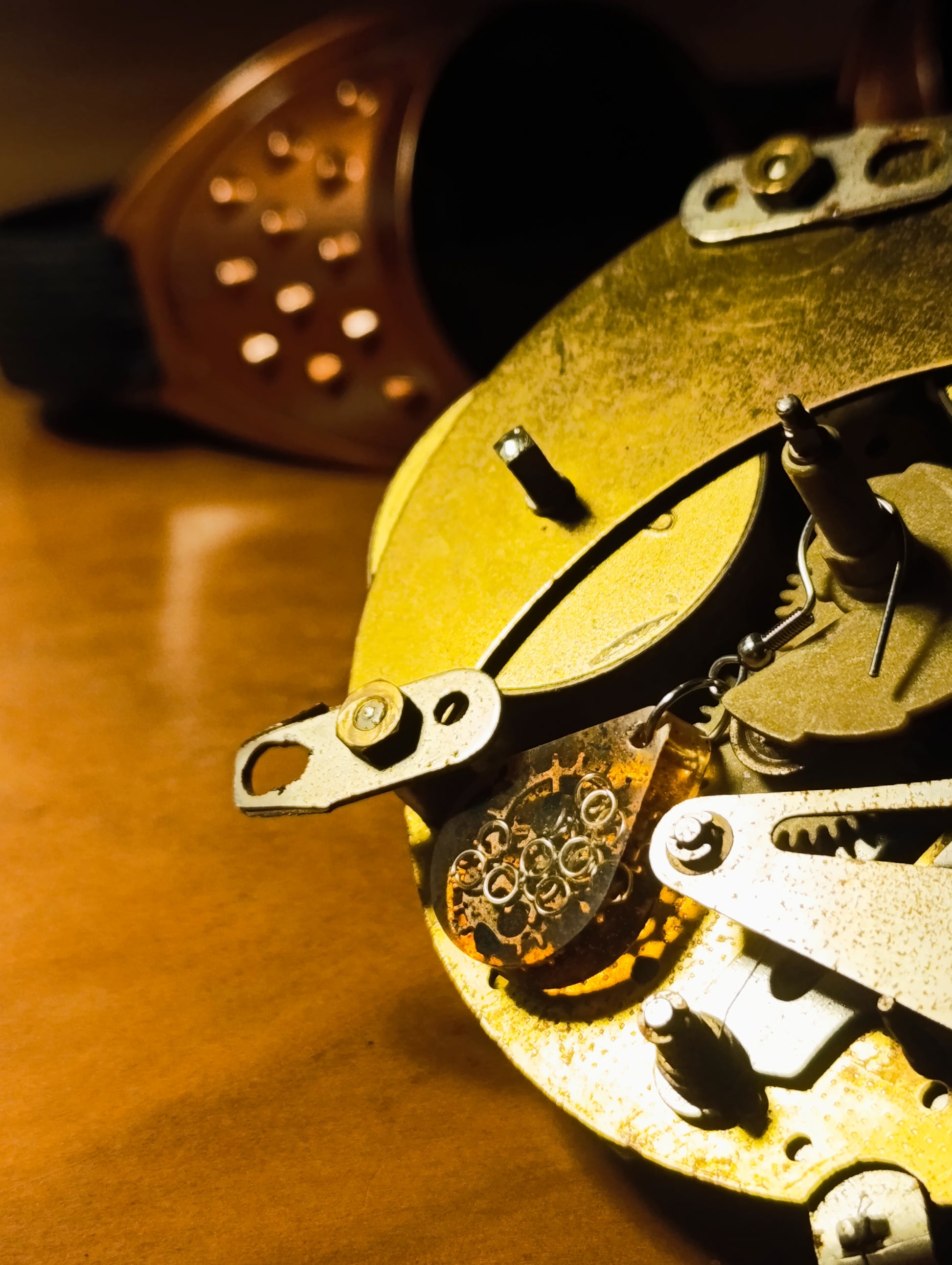 Cette paire ambrée met en scène des engrenages et des fragments d’acier qui s’entrechoquent. Des éclats noirs et de petits pigments viennent donner du relief à cette création issue d’une forge souterraine, où métal et feu cohabitent dans un ballet mécanique.