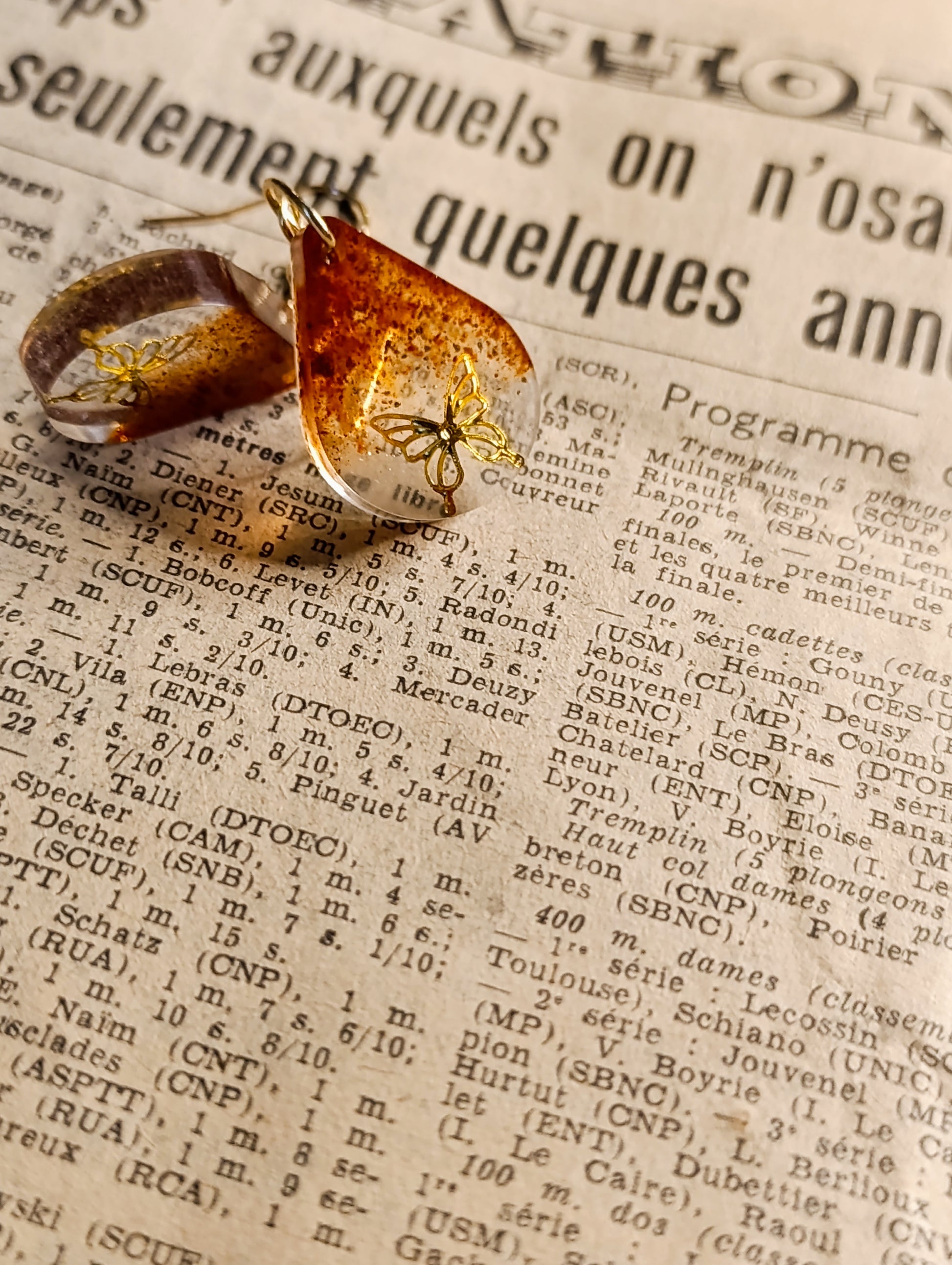 Au cœur de chaque bijou repose un papillon en acier doré, figé dans l’éternité. Le haut des pendentifs s’embrase d’un ambre profond aux reflets rougeâtres, résultat d’un délicat mélange de pigments qui donne à la création tout son relief.