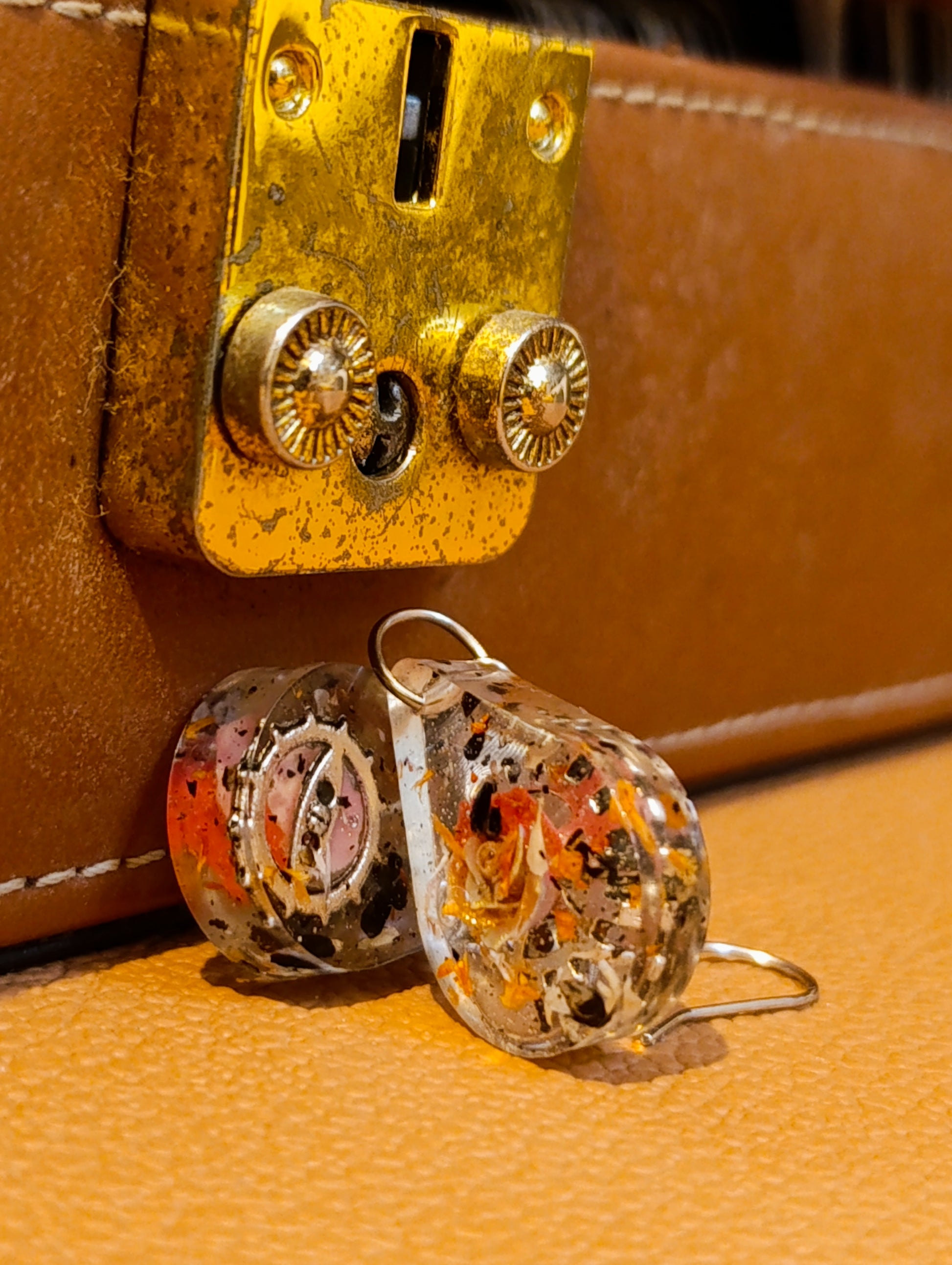 Cette paire translucide capture une tempête figée dans la résine : une fleur rose, posée sur un engrenage, remonte au centre et déforme légèrement la couche de résine, donnant un effet piquant et surprenant à la paire. Autour d’elle, éclats noirs et particules rose et orangées créent un véritable tableau miniature, où chaque élément semble danser autour de la fleur, emprisonnée à jamais dans ce chaos délicat.
