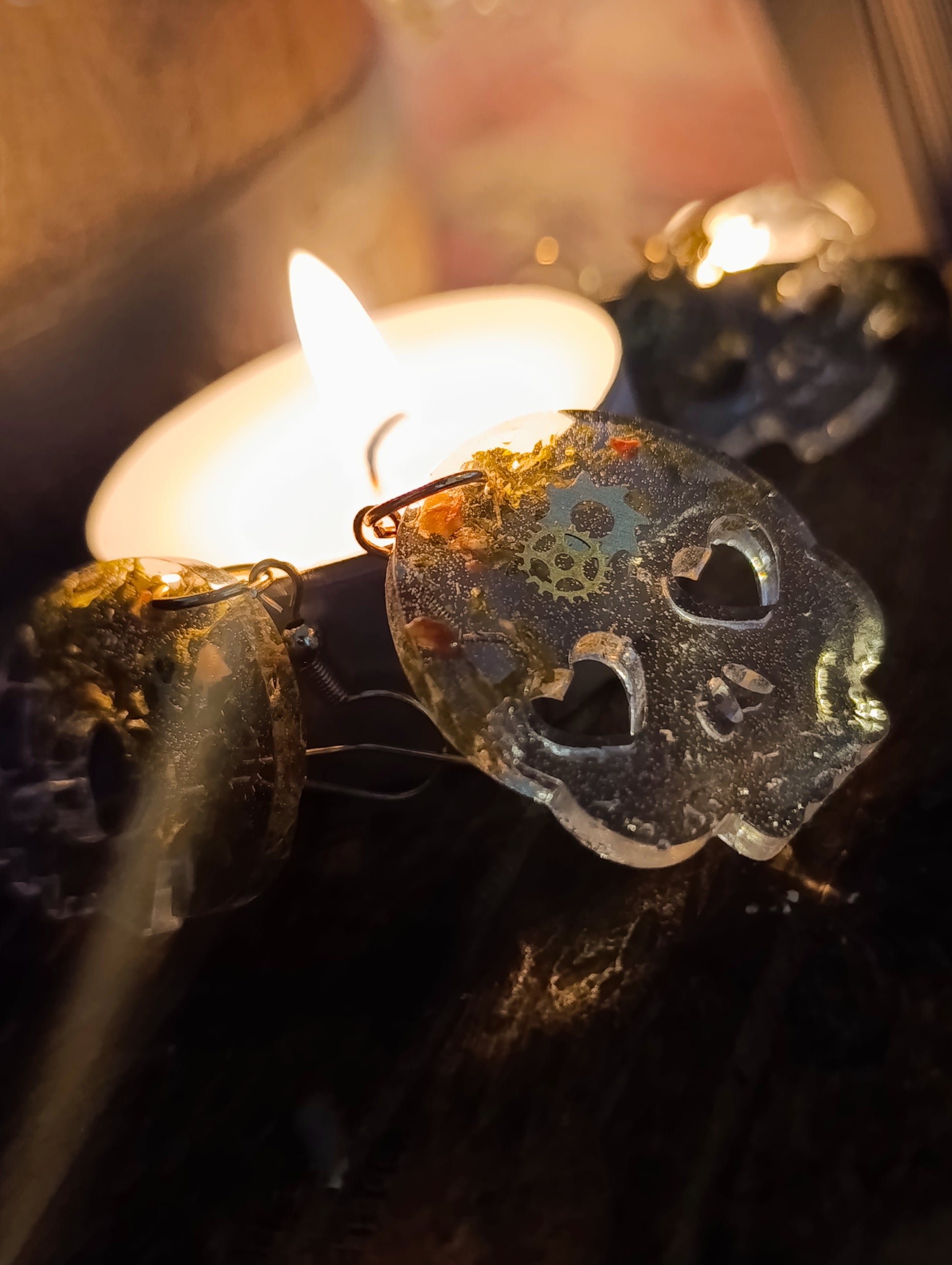 Osez l’originalité avec ces boucles d’oreilles en forme de crâne transparent, où la résine cristalline révèle un subtil mélange de nature et de mécanique. De fines touches de verdure, emprisonnées dans la matière, apportent une dimension organique et poétique, contrastée par de petits rouages steampunk soigneusement placés au sommet du crâne, comme une couronne d’engrenages.