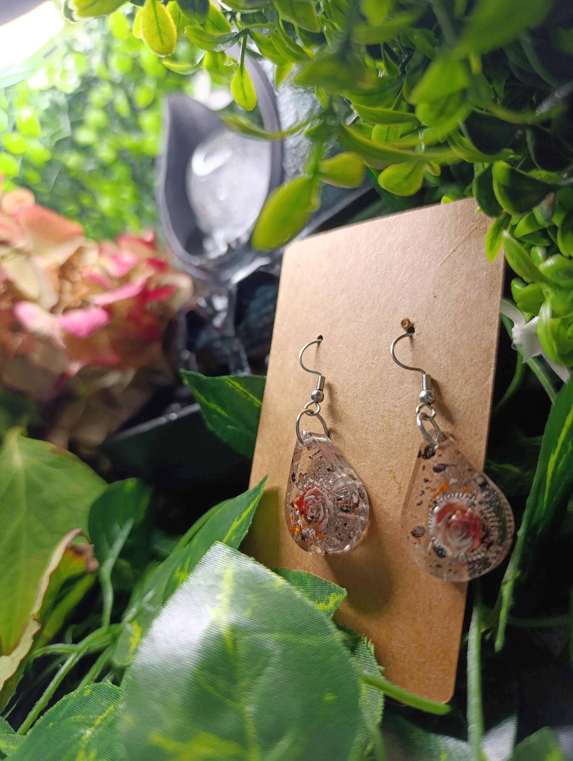 Cette paire translucide capture une tempête figée dans la résine : une fleur rose, posée sur un engrenage, remonte au centre et déforme légèrement la couche de résine, donnant un effet piquant et surprenant à la paire. Autour d’elle, éclats noirs et particules rose et orangées créent un véritable tableau miniature, où chaque élément semble danser autour de la fleur, emprisonnée à jamais dans ce chaos délicat.